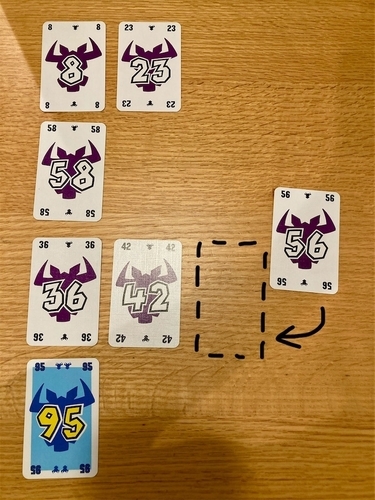 この列の4枚目に置けそう!と思ったのに、他のプレイヤーの出したカードに割り込まれて結局6枚目になっちゃった…となることがしばしば。