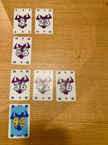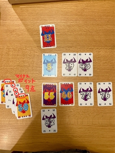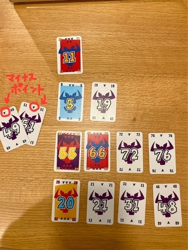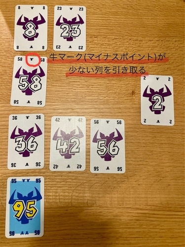 6枚目に置いた人はその列のカードを受け取り、カードに描かれている牛マークの数がマイナスポイントとなります。