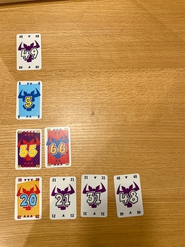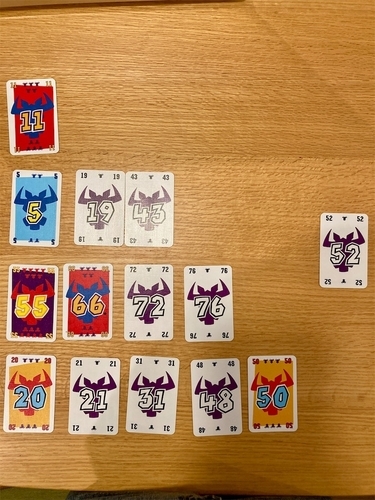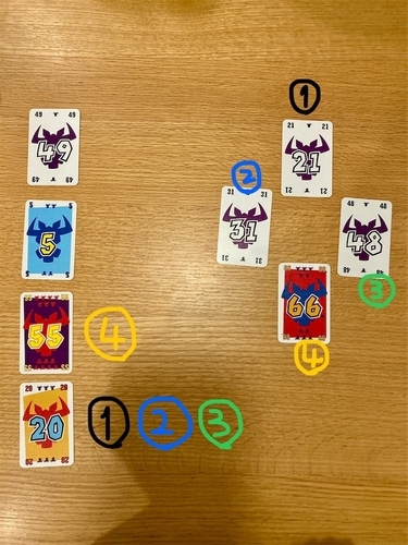 11が一番上の列を引き取り、52が一番下の列を引き取ることになる - 全員の手札がなくなるまで繰り返す(つまり10回)→1ラウンド終了