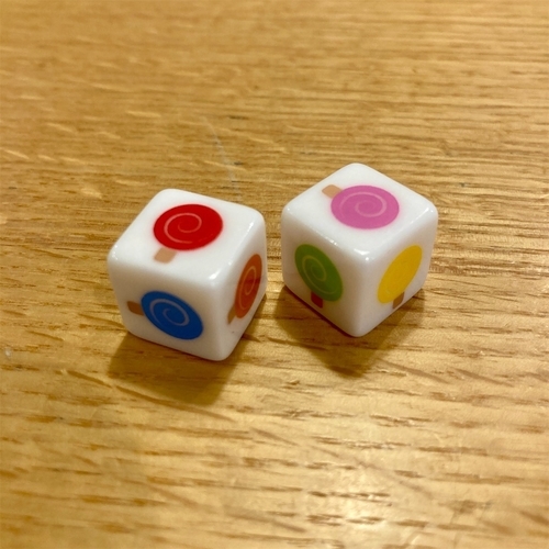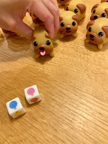自分の手番では振ったサイコロ(2つ)のキャンディと同じ色の舌のパグを見つけていきます。