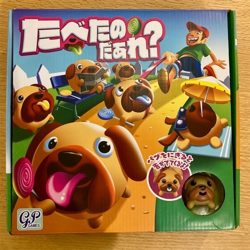「たべたのだぁれ?」は、サイコロと同じ色の舌のパグを見つけるという神経衰弱ボードゲームです。